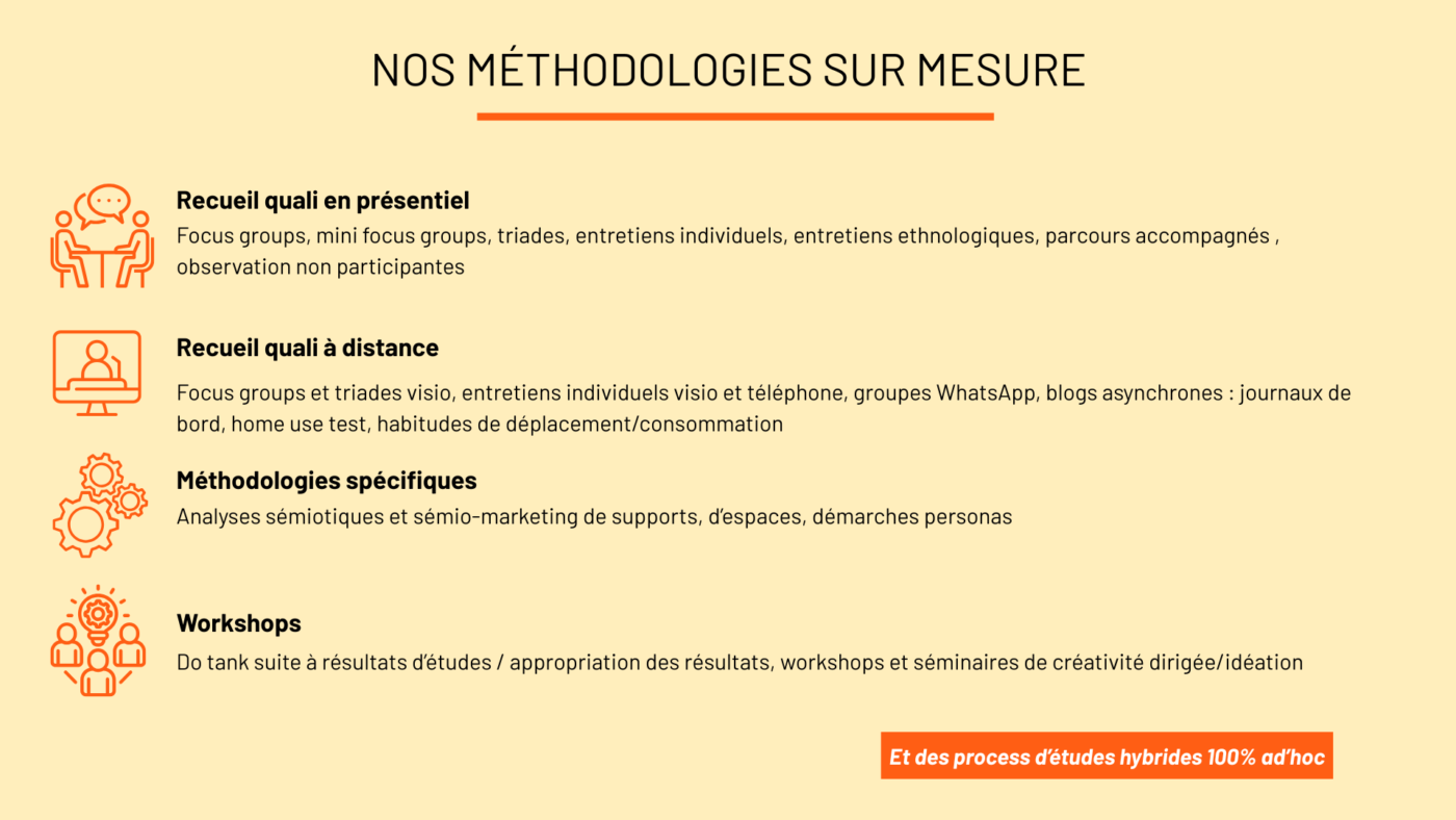 Notre département études qualitatives intégré est composé d’une équipe ayant une philosophie et un savoir-faire nés de la double culture du planning stratégique et des études qualitatives. Les expertises multiples des membres de notre équipe (sociologie, ethnologie, marketing, sciences du langage) permettent de varier les angles d’analyses et de vous fournir des résultats d’études à la fois inspirant et opérationnels.